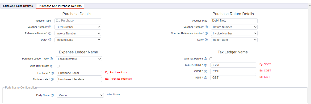 By making the use of Party Name Configuration, user can modify the name/ voucher type, ledger type, etc. of the Vendor, Transporter, marketplaces, and B2B customer as per Tally.