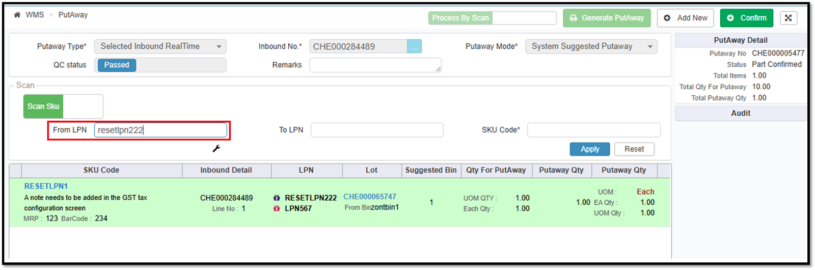 A new functionality has been added to the system-suggested putaway process. Once the “From LPN” is scanned, it remains fixed until: