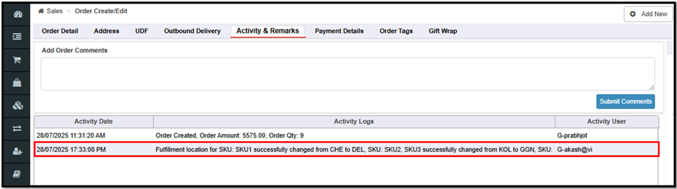 Users can track fulfilment location changes for any SKU within the Activity & Remarks section of the Order Create/Edit screen.
