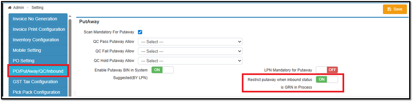 Navigation: Admin >> Settings >> PO/Putaway/QC/Inbound