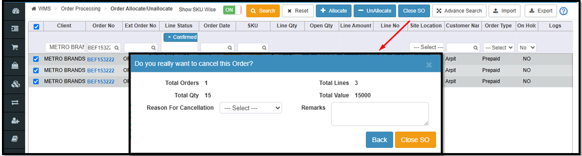 A new “Close SO” feature has been introduced under the Order Allocate/Unallocate screen (SKU-Wise screen), enabling bulk closure/cancellation of unfulfilled order lines.