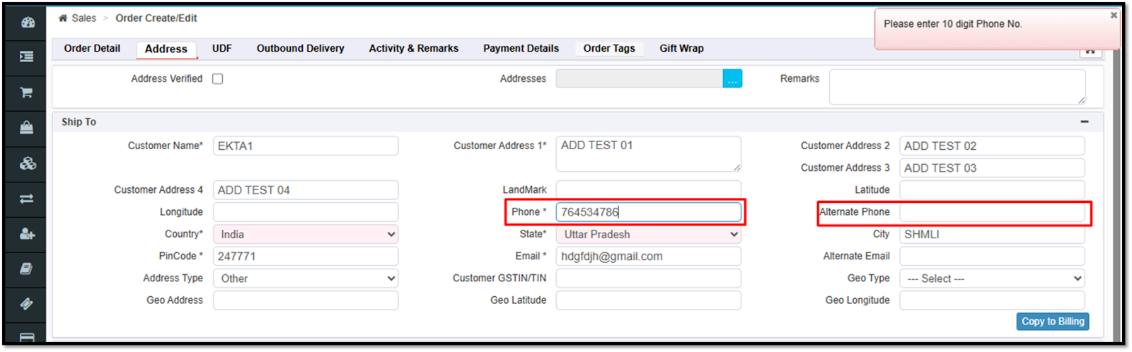 Previously, while creating orders, there was no validation on the phone field. The system now validates phone numbers for customers whose country is India, ensuring that only standard 10-digit Indian phone number formats are accepted.