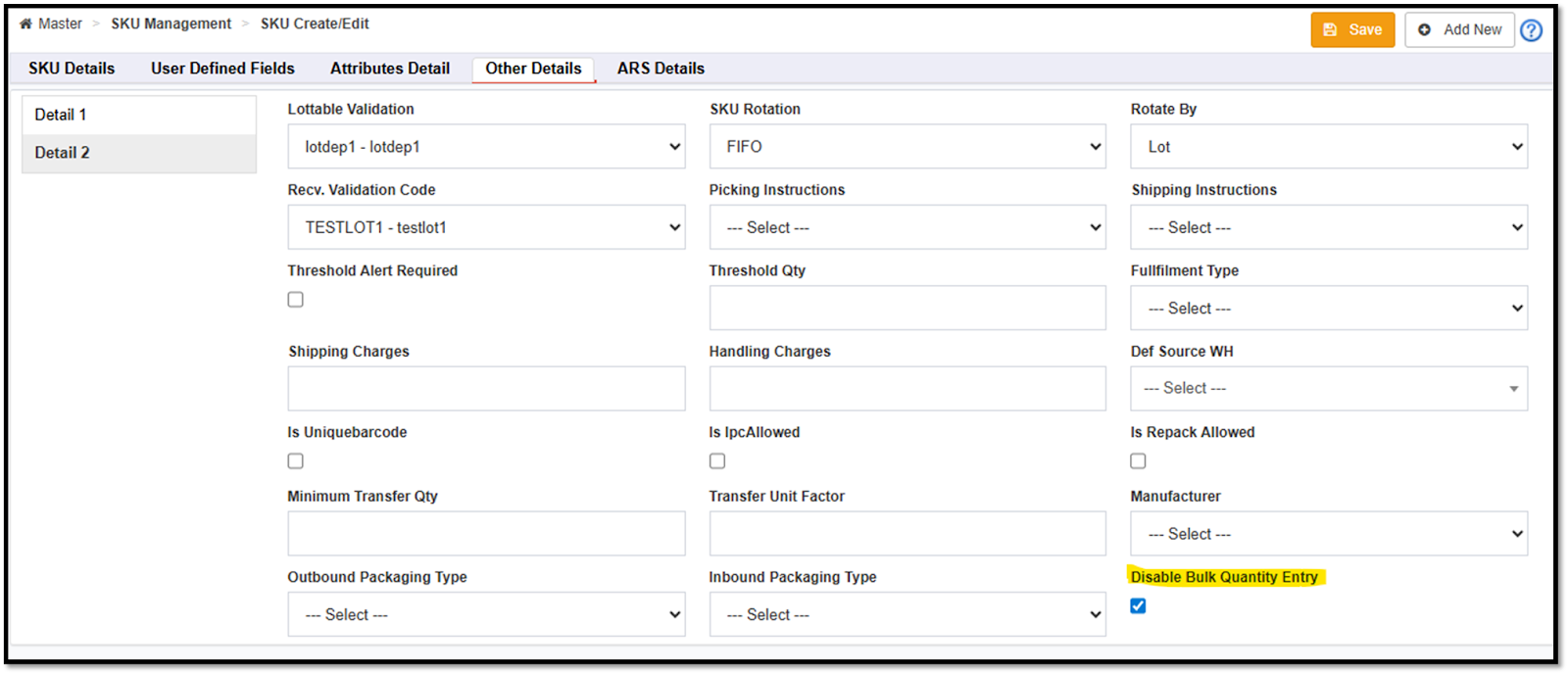 Navigation: WMS >> SKU Management >> SKU Create/Edit