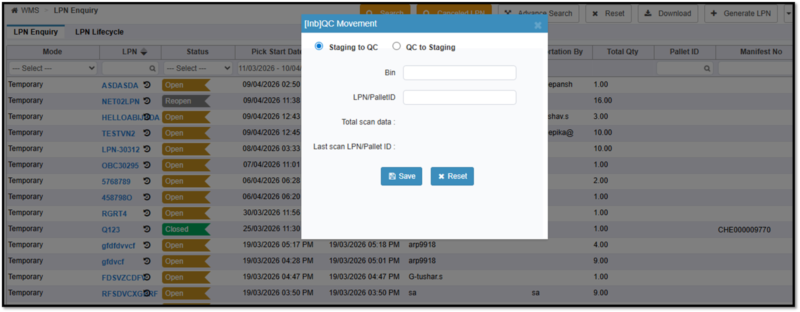 Added “QC Movement” option in both Web (LPN Enquiry) and Mobile App (Receiving module).